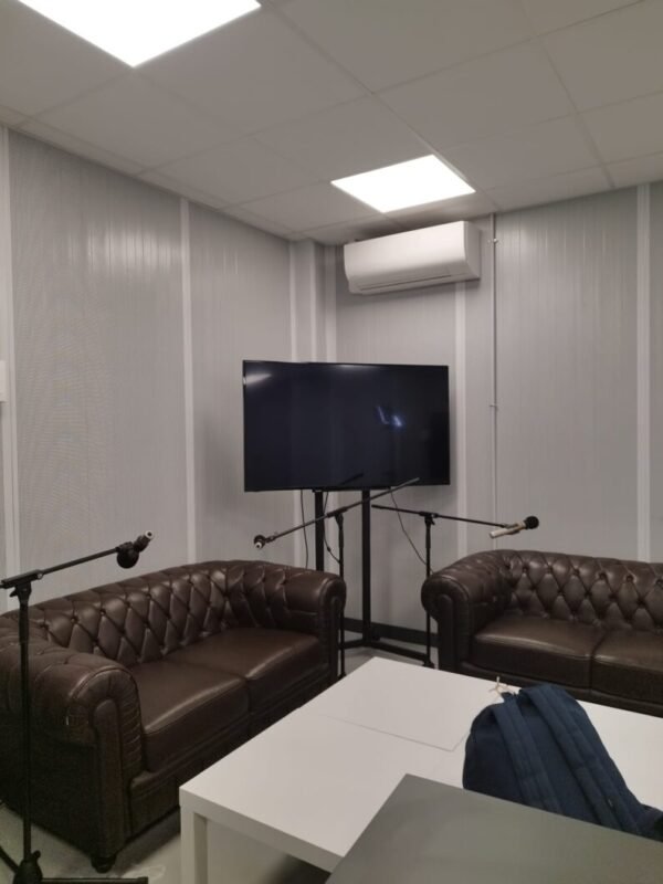 Imagen del plató donde se graba el videopodcast con dos sofás de cuero, micrófonos y una televisión